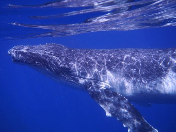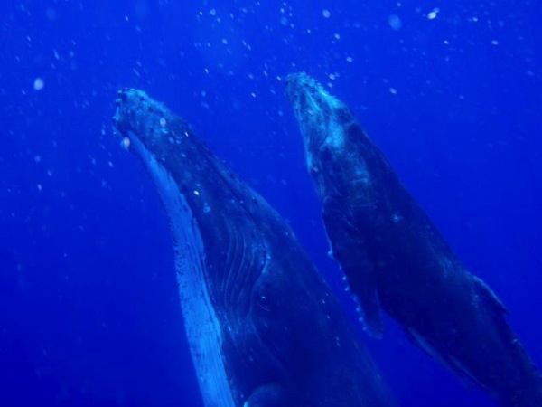 There is nothing that I can say to convey the feeling that I felt when I spotted a whale while in the water for the first time. I was swimming to where our guide told us to go and just then he points down below us. I look down and a few feet down from me was a mother and her escort. Usually a mother and a calf have an escort during the first year of the calf's life. It isn't confirmed if it is the father or just another whale, but their purpose is to keep the mother and calf safe and stress-free from predators. Looking down and seeing what was in front of me, I could feel the hair on the back of my neck stand straight up because not only was it exhilarating, it was a bit unnerving. THERE WERE WHALES RIGHT BELOW ME! Just when I thought I had never seen anything quite like what I was looking at, a little calf comes up from under it's mother and swims straight towards me, swimming right past Martin and me to the surface for some air.